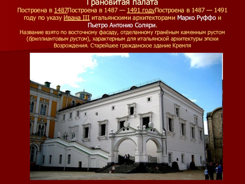 — 1491 году по указу Ивана III итальянскими архитекторами Марко Руффо и Пьетро Антонио Соляри.