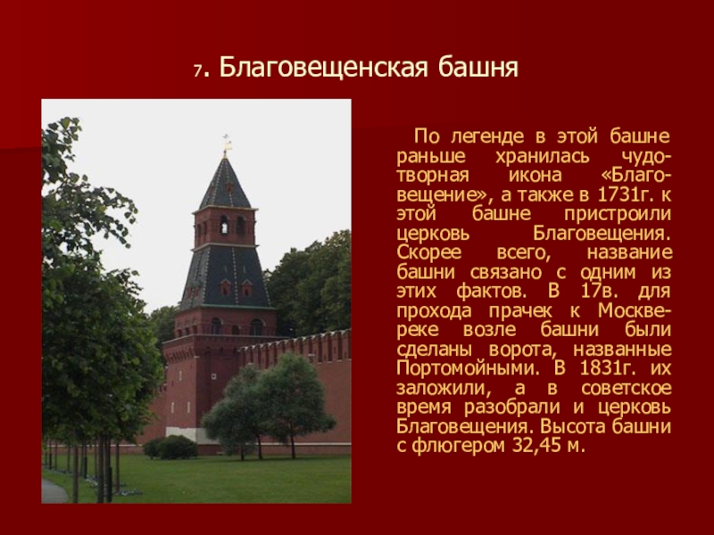 чудо-творная икона «Благо-вещение», а также в 1731г. к этой башне пристроили церковь Благовещения. Скорее всего, название башни связано с одним из этих фактов. В 17в. для прохода прачек к Москве-реке возле башни были сделаны ворота, названные Портомойными. В 1831г. их заложили, а в советское время разобрали и церковь Благовещения. Высота башни с флюгером 32,45 м.