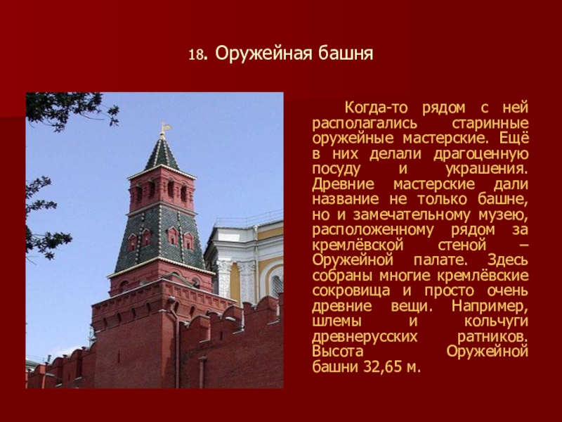 мастерские. Ещё в них делали драгоценную посуду и украшения. Древние мастерские дали название не только башне, но и замечательному музею, расположенному рядом за кремлёвской стеной –Оружейной палате. Здесь собраны многие кремлёвские сокровища и просто очень древние вещи. Например, шлемы и кольчуги древнерусских ратников. Высота Оружейной башни 32,65 м.