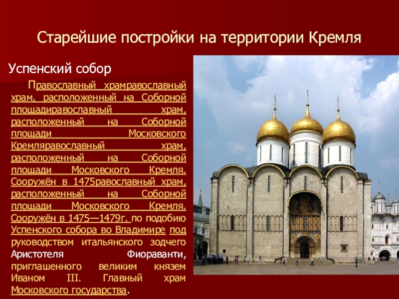 храмравославный храм, расположенный на Соборной площадиравославный храм, расположенный на Соборной площади Московского Кремляравославный храм, расположенный на Соборной площади Московского Кремля. Сооружён в 1475равославный храм, расположенный на Соборной площади Московского Кремля. Сооружён в 1475—1479г. по подобию Успенского собора во Владимире под руководством итальянского зодчего Аристотеля Фиораванти, приглашенного великим князем Иваном III. Главный храм Московского государства.