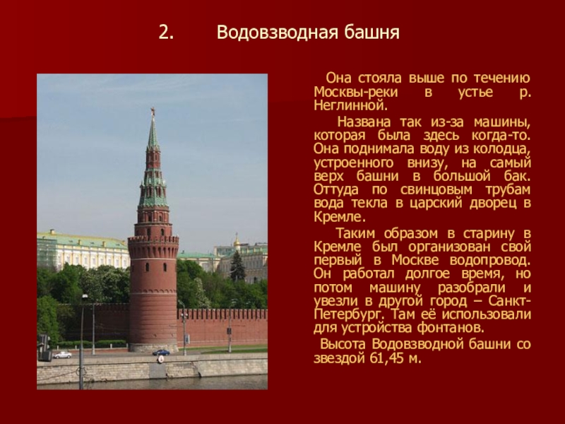 Слайд 17У Водовзводной башни кремлёвская стена поворачивает от реки.
