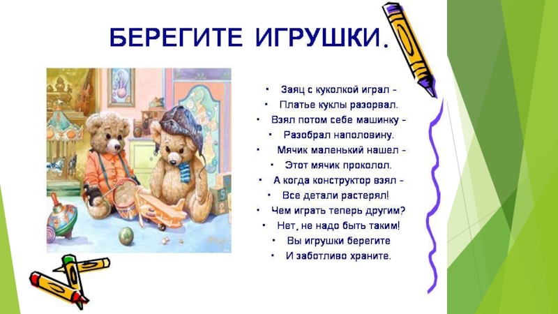 Презентация, доклад для дошкольников по развитию речи Берегите игрушки