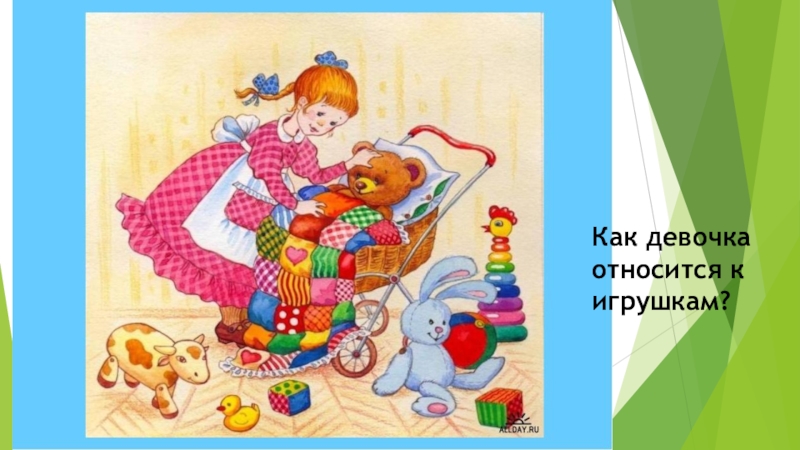 Слайд 7Как девочка относится к игрушкам?