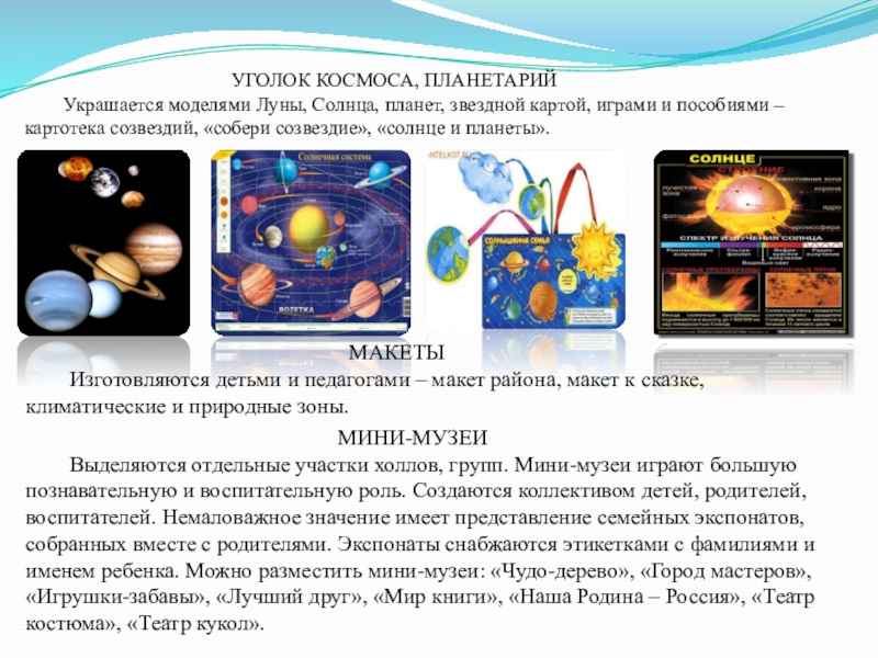 Украшается моделями Луны, Солнца, планет, звездной картой, играми и пособиями – картотека созвездий, «собери созвездие», «солнце и планеты».