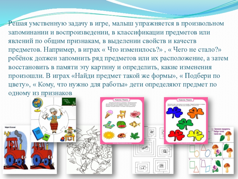 воспроизведении, в классификации предметов или явлений по общим признакам, в выделении свойств и качеств предметов. Например, в играх « Что изменилось?» , « Чего не стало?» ребёнок должен запомнить ряд предметов или их расположение, а затем восстановить в памяти эту картину и определить, какие изменения произошли. В играх «Найди предмет такой же формы», « Подбери по цвету», « Кому, что нужно для работы» дети определяют предмет по одному из признаков