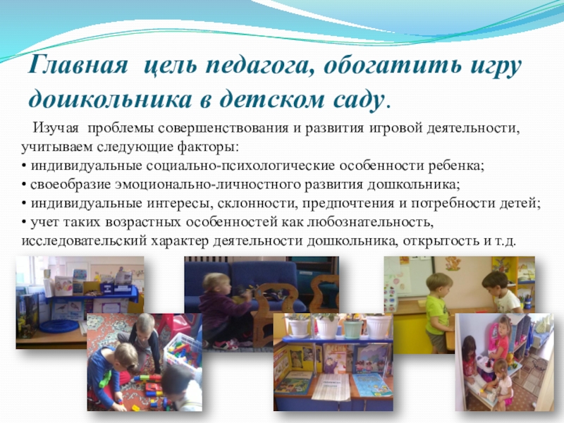Слайд 13Главная цель педагога, обогатить игру дошкольника в детском саду.
