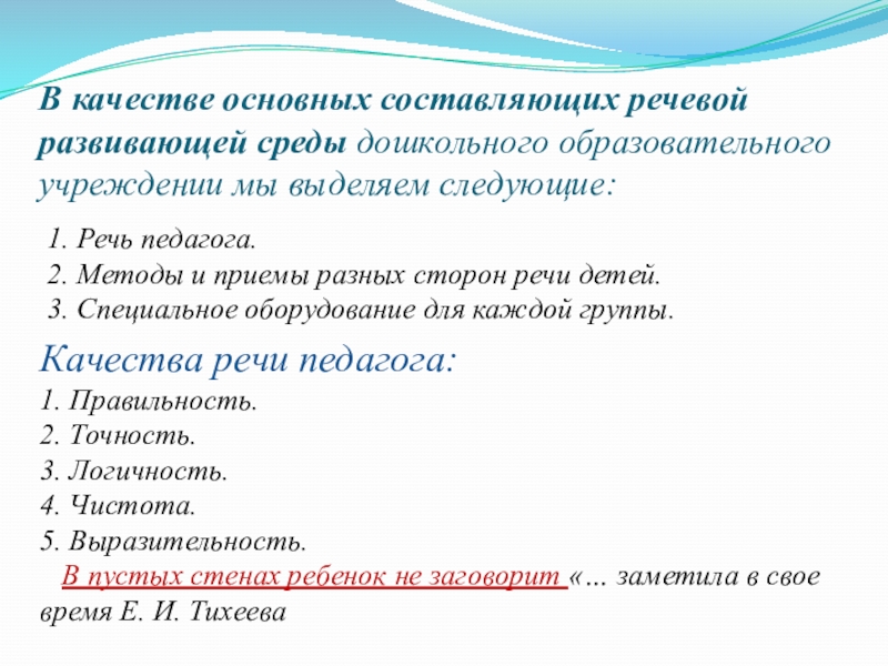 Слайд 3В качестве основных составляющих речевой развивающей среды дошкольного образовательного учреждении мы