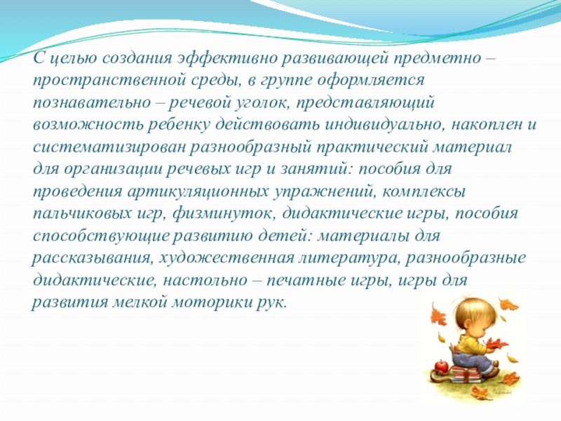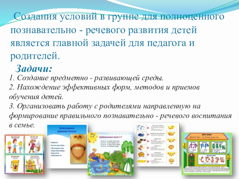 Слайд 2 Создания условий в группе для полноценного познавательно - речевого развития