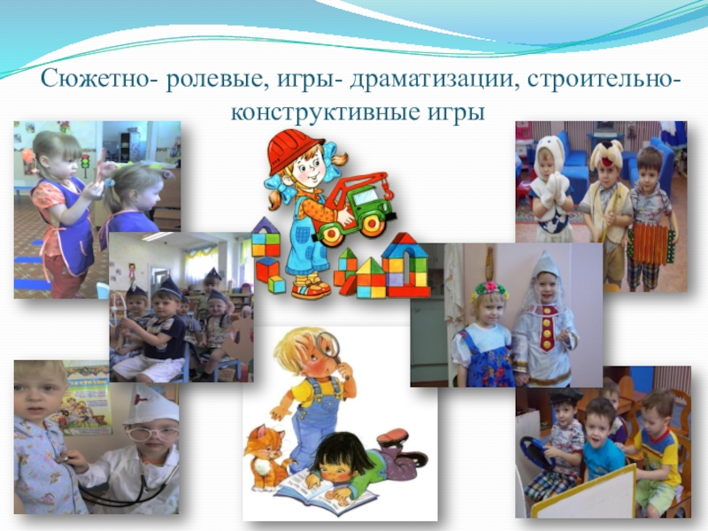 Слайд 10Сюжетно- ролевые, игры- драматизации, строительно- конструктивные игры