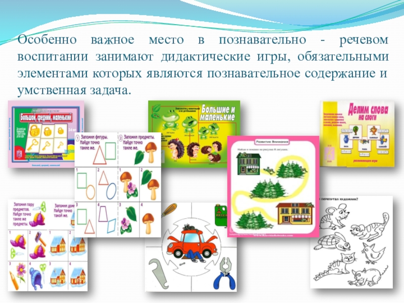 Слайд 11Особенно важное место в познавательно - речевом воспитании занимают дидактические игры,