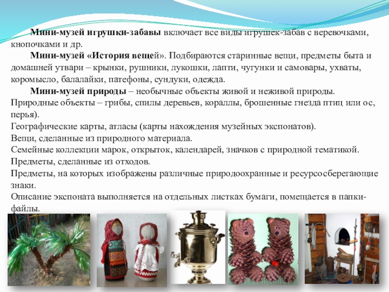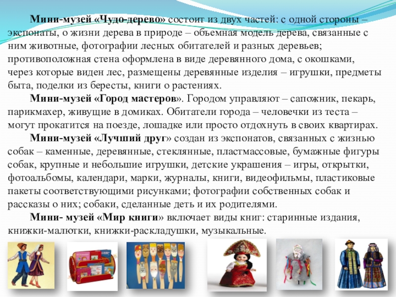 Выделяются отдельные участки холлов, групп. Мини-музеи играют большую познавательную и воспитательную роль. Создаются коллективом детей, родителей, воспитателей. Немаловажное значение имеет представление семейных экспонатов, собранных вместе с родителями. Экспонаты снабжаются этикетками с фамилиями и именем ребенка. Можно разместить мини-музеи: «Чудо-дерево», «Город мастеров», «Игрушки-забавы», «Лучший друг», «Мир книги», «Наша Родина – Россия», «Театр костюма», «Театр кукол».