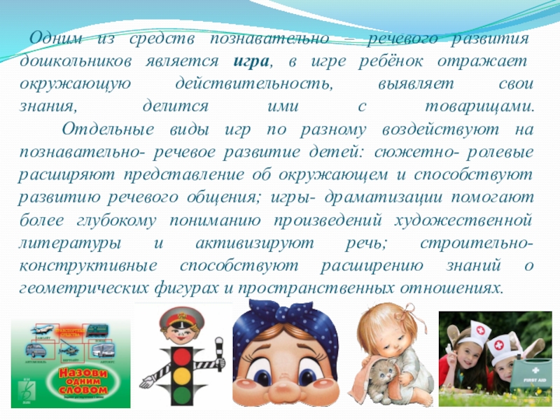 Слайд 9 Одним из средств познавательно – речевого развития дошкольников является игра,