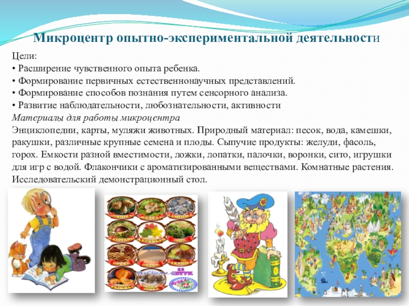 Энциклопедии, карты, муляжи животных. Природный материал: песок, вода, камешки, ракушки, различные крупные семена и плоды. Сыпучие продукты: желуди, фасоль, горох. Емкости разной вместимости, ложки, лопатки, палочки, воронки, сито, игрушки для игр с водой. Флакончики с ароматизированными веществами. Комнатные растения. Исследовательский демонстрационный стол.