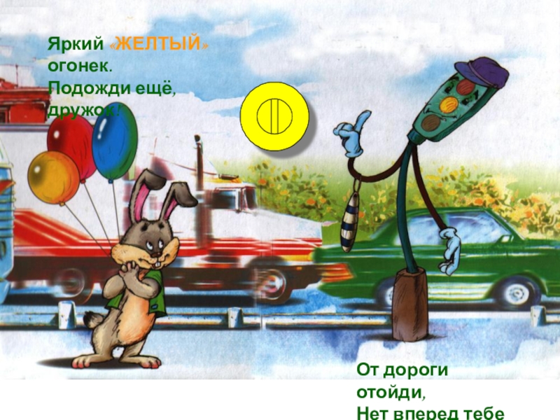 Яркий «ЖЕЛТЫЙ» огонек.Подожди ещё, дружок!От дороги отойди,Нет вперед тебе пути!