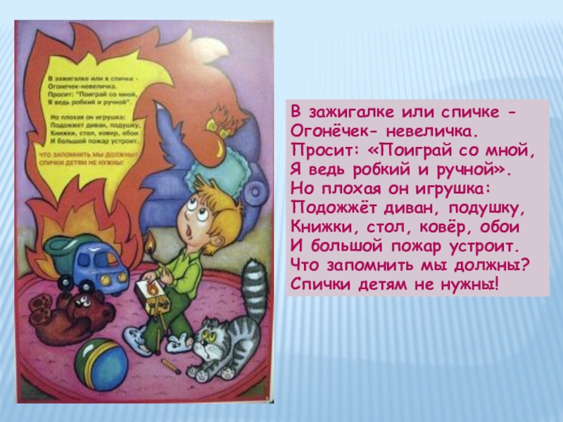 Жарко вспыхнула квартира, Плачет маленькая Ира. Ваня –старший брат- кричит: «Убегаем, дом горит!» Ире боязно бежать; «Лучше