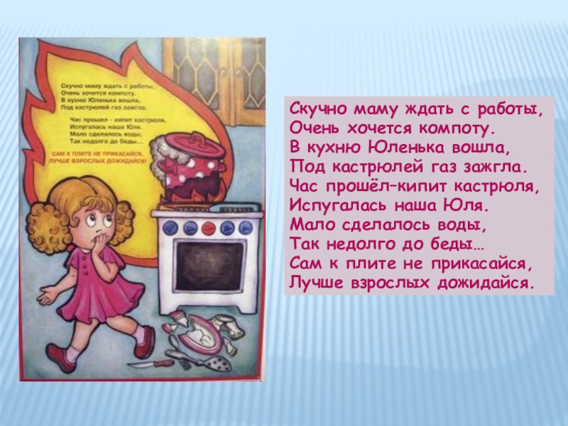 Скучно маму ждать с работы, Очень хочется компоту. В кухню Юленька вошла, Под кастрюлей газ зажгла.Час прошёл–кипит кастрюля, Испугалась наша Юля. Мало сделалось воды, Так недолго до беды… Сам к плите не прикасайся, Лучше взрослых дожидайся.