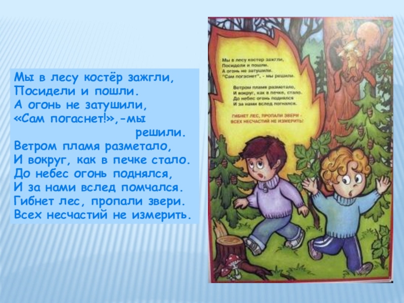 Мы в лесу костёр зажгли,Посидели и пошли.А огонь не затушили,«Сам погаснет!»,-мы