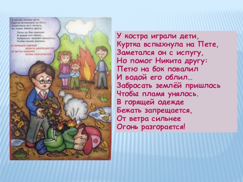 У костра играли дети,Куртка вспыхнула на Пете,Заметался он с испугу,Но помог Никита другу:Петю на бок повалилИ водой