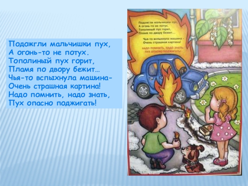 Подожгли мальчишки пух,А огонь-то не потух.Тополиный пух горит,Пламя по двору бежит…Чья-то вспыхнула машина-Очень страшная картина!Надо помнить, надо