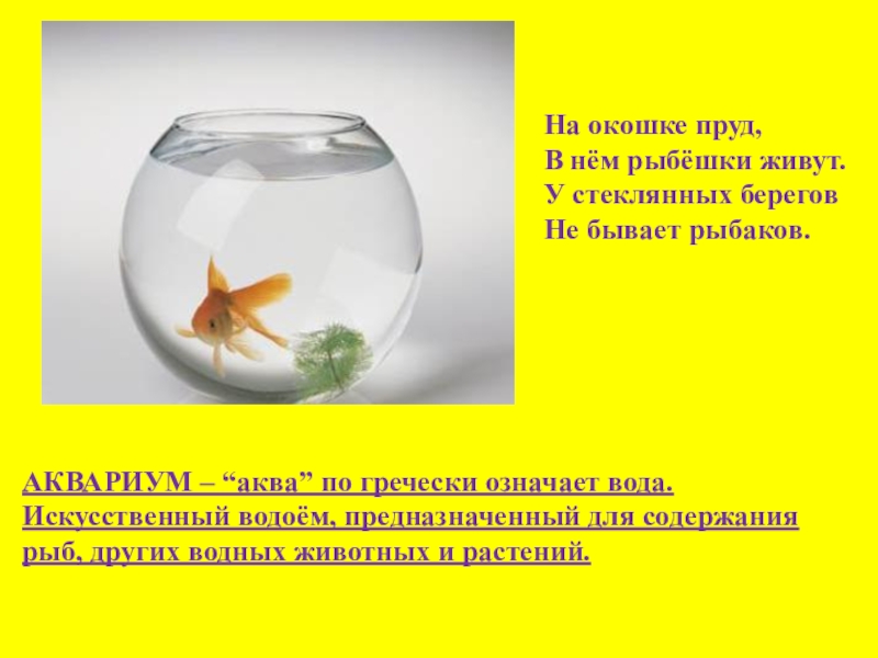 На окошке пруд, В нём рыбёшки живут. У стеклянных берегов Не бывает рыбаков.АКВАРИУМ – “аква” по гречески означает вода. Искусственный водоём, предназначенный для содержания рыб, других водных