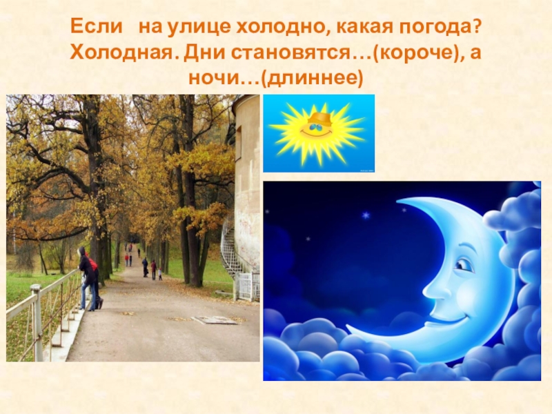Слайд 13Если на улице холодно, какая погода? Холодная. Дни становятся…(короче), а