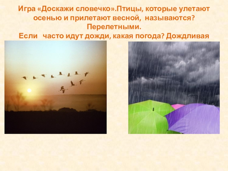 Игра «Доскажи словечко».Птицы, которые улетают осенью и прилетают весной, называются? Перелетными. Если  часто идут дожди, какая