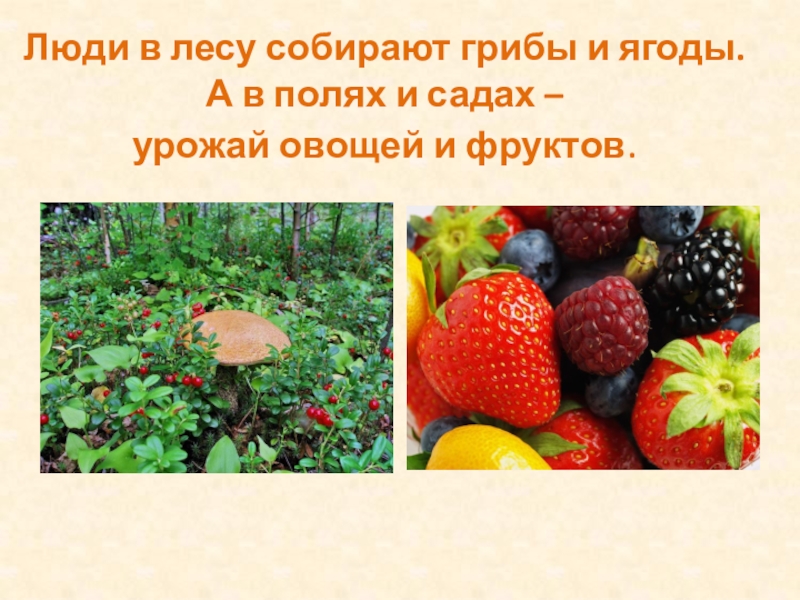 Слайд 11 Люди в лесу собирают грибы и ягоды. А в полях и