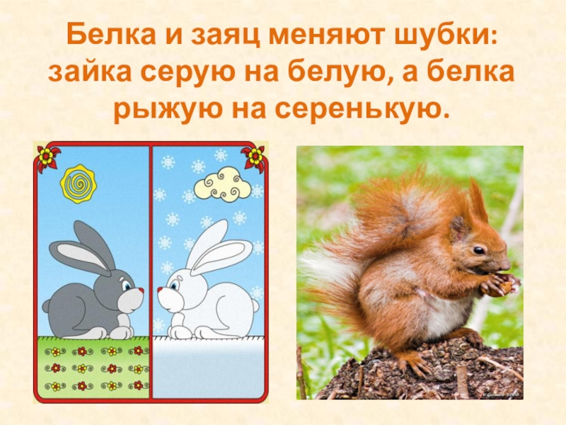 Слайд 10Белка и заяц меняют шубки: зайка серую на белую, а белка