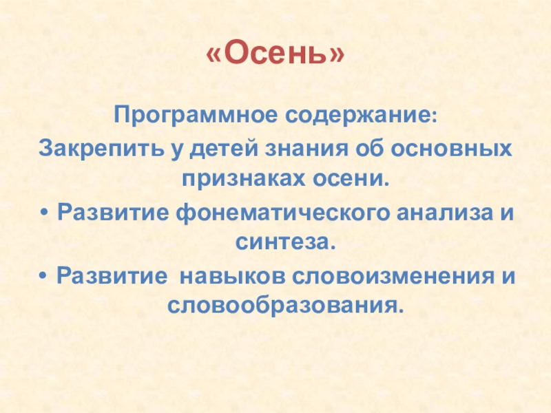 «Осень» Программное содержание: Закрепить у детей знания об основных признаках осени.Развитие фонематического анализа и синтеза.Развитие навыков словоизменения и словообразования.