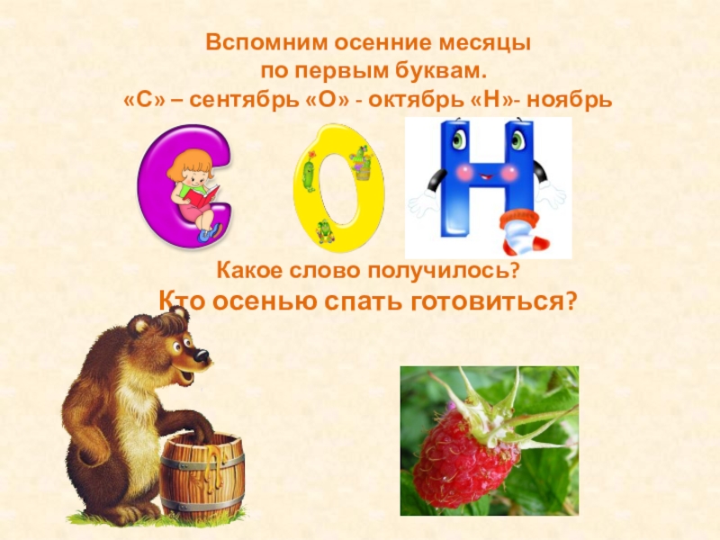 Слайд 8 Вспомним осенние месяцы по первым буквам. «С» – сентябрь «О» - октябрь