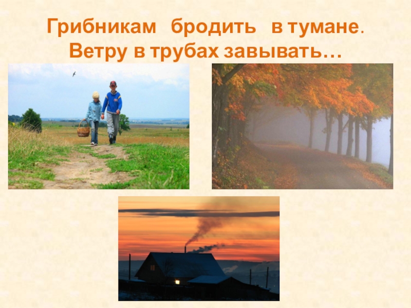 Слайд 4Грибникам бродить в тумане. Ветру в трубах завывать…