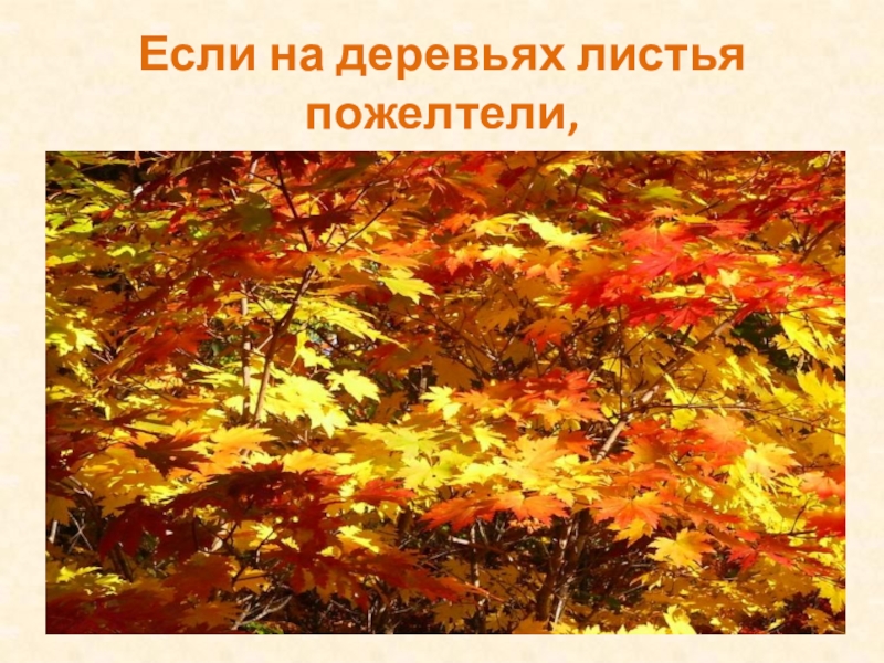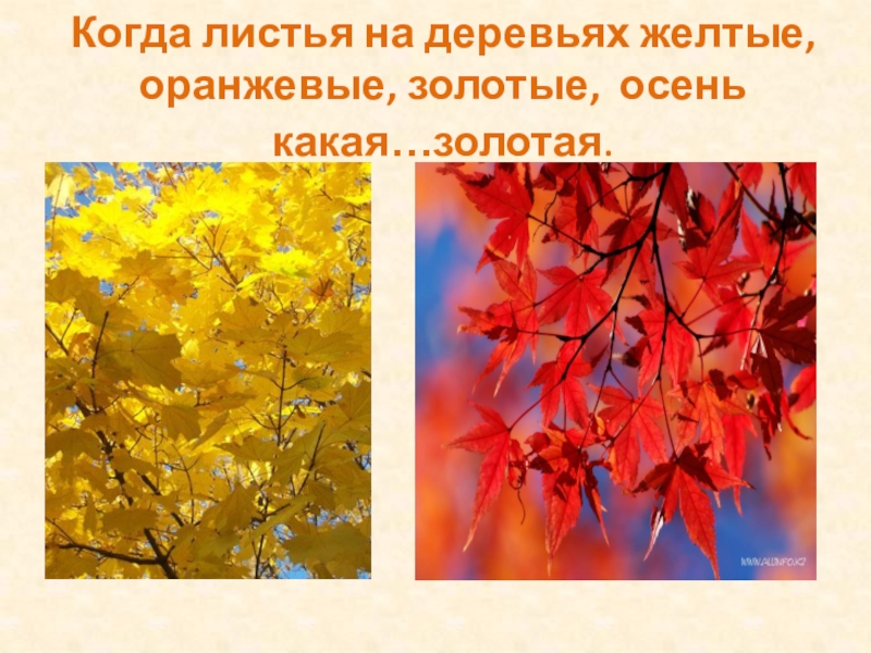 Слайд 15Когда листья на деревьях желтые, оранжевые, золотые, осень какая…золотая.