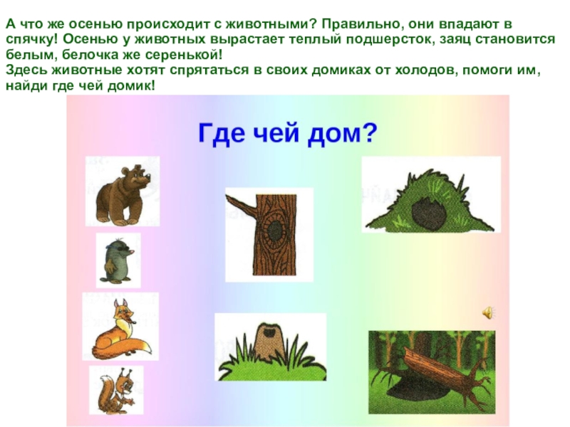 спячку! Осенью у животных вырастает теплый подшерсток, заяц становится белым, белочка же серенькой! Здесь животные хотят спрятаться в своих домиках от холодов, помоги им, найди где чей домик!
