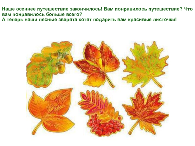 Слайд 9Наше осеннее путешествие закончилось! Вам понравилось путешествие? Что вам понравилось больше