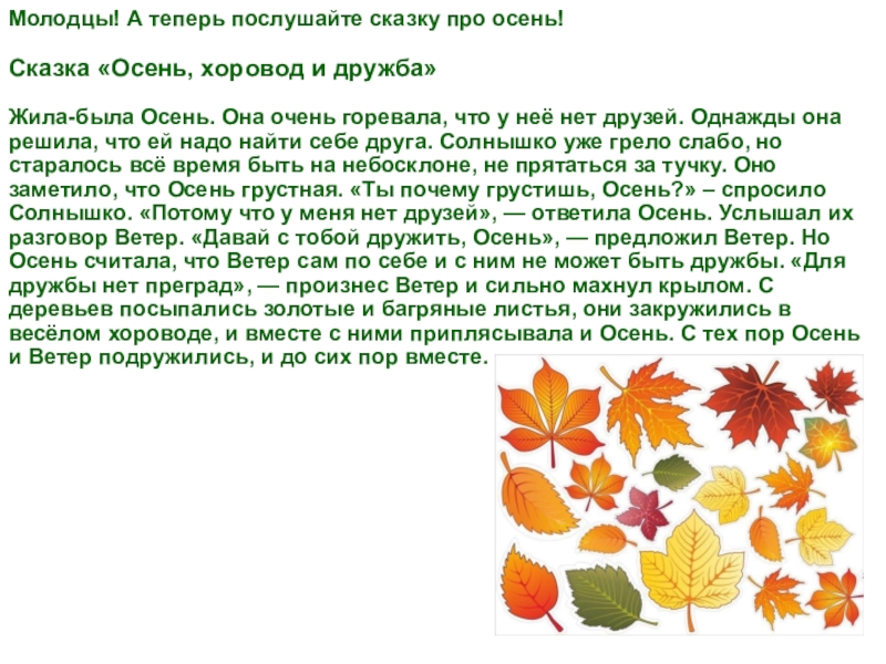 Молодцы! А теперь послушайте сказку про осень!  Сказка «Осень, хоровод и дружба»  Жила-была Осень. Она