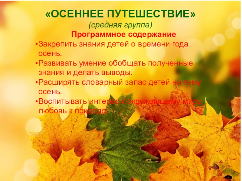 «ОСЕННЕЕ ПУТЕШЕСТВИЕ»(средняя группа)Программное содержаниеЗакрепить знания детей о времени года осень. Развивать умение обобщать полученные знания и делать выводы. Расширять словарный запас детей на тему осень.Воспитывать интерес к окружающему миру,