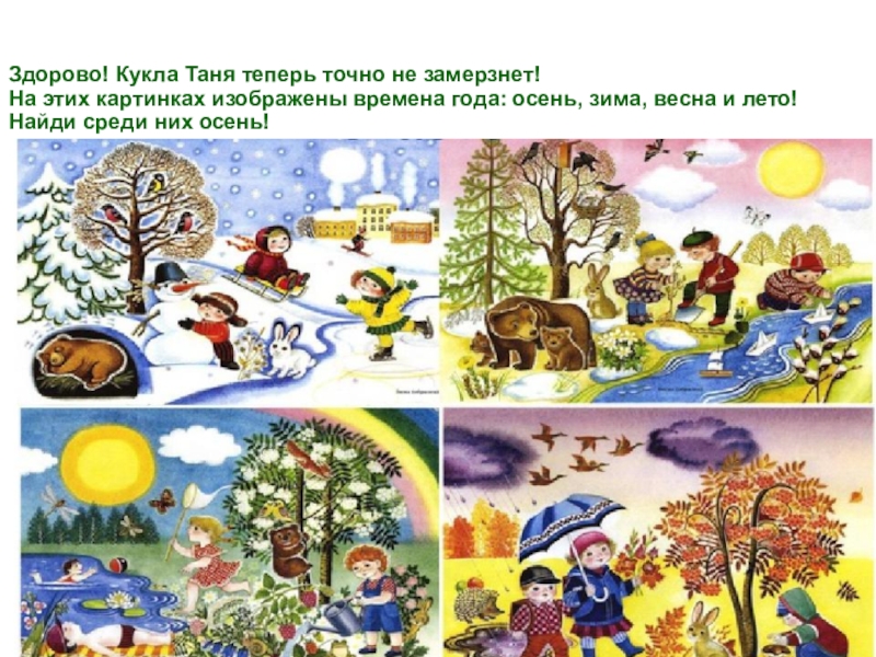 Здорово! Кукла Таня теперь точно не замерзнет!  На этих картинках изображены времена года: осень, зима, весна