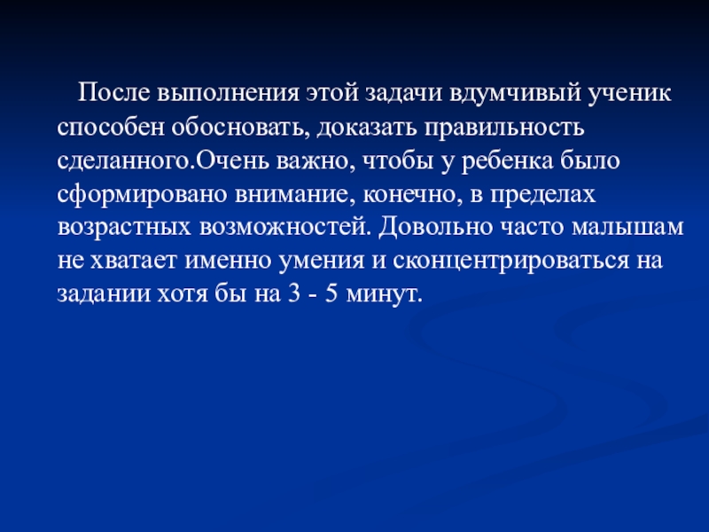 способен обосновать, доказать правильность сделанного.Очень важно, чтобы у ребенка было сформировано внимание, конечно, в пределах возрастных возможностей. Довольно часто малышам не хватает именно умения и сконцентрироваться на задании хотя бы на 3 - 5 минут.