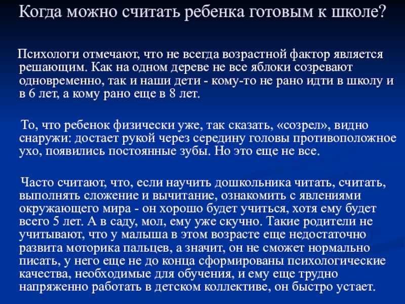 отмечают, что не всегда возрастной фактор является решающим. Как на одном дереве не все яблоки созревают одновременно, так и наши дети - кому-то не рано идти в школу и в 6 лет, а кому рано еще в 8 лет.