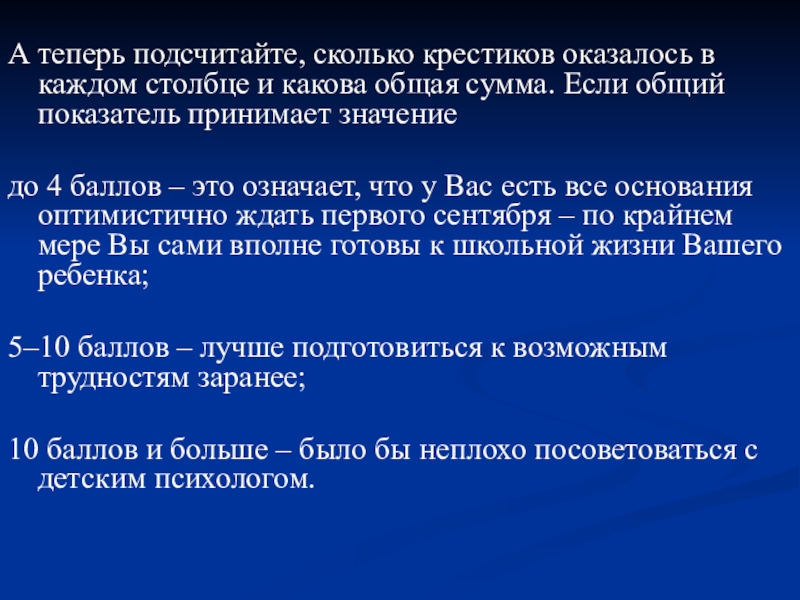 до 4 баллов – это означает, что у Вас есть все основания оптимистично ждать первого сентября – по крайнем мере Вы сами вполне готовы к школьной жизни Вашего ребенка;