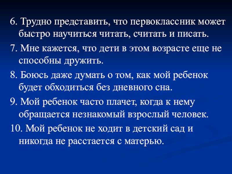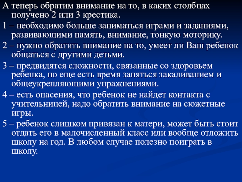 5 – ребенок слишком привязан к матери, может быть стоит отдать его в малочисленный класс или вообще отложить школу на год. В любом случае полезно поиграть в школу.