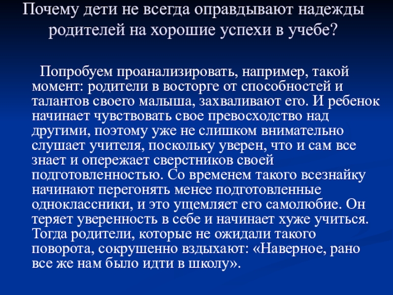 Слайд 3Почему дети не всегда оправдывают надежды родителей на хорошие успехи в