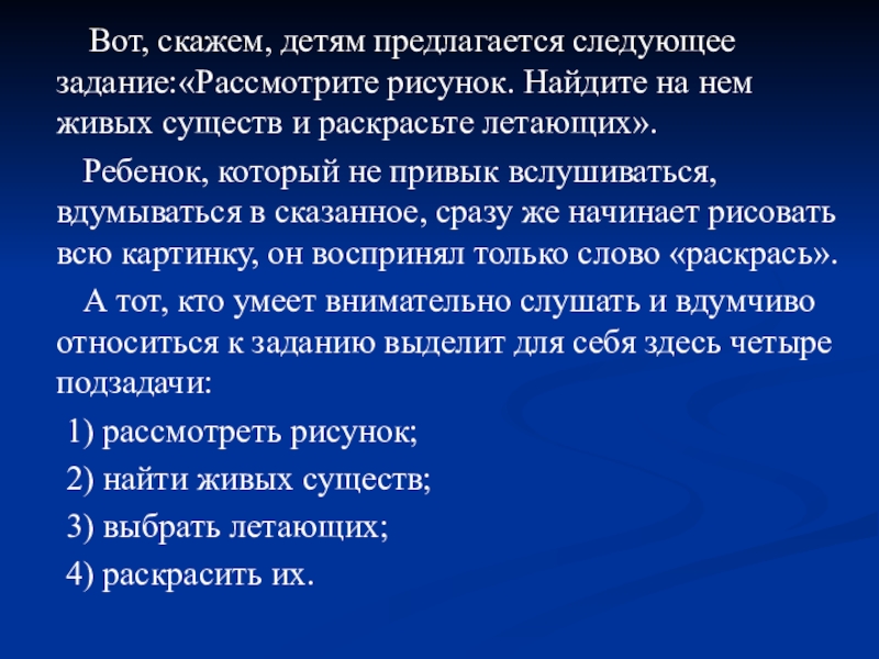 Ребенок, который не привык вслушиваться, вдумываться в сказанное, сразу же начинает рисовать всю картинку, он воспринял только слово «раскрась».