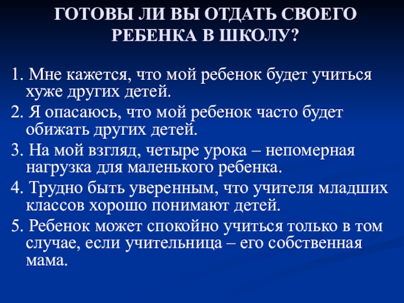 Слайд 7ГОТОВЫ ЛИ ВЫ ОТДАТЬ СВОЕГО РЕБЕНКА В ШКОЛУ?