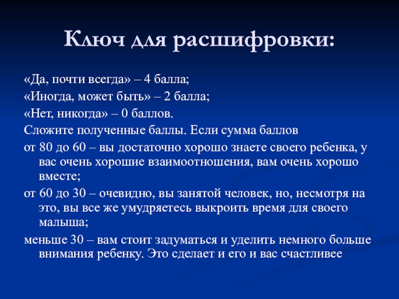 от 80 до 60 – вы достаточно хорошо знаете своего ребенка, у вас очень хорошие взаимоотношения, вам очень хорошо вместе;