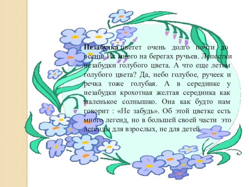 Лепестки незабудки голубого цвета. А что еще летом голубого цвета? Да, небо голубое, ручеек и речка тоже голубая. А в серединке у незабудки крохотная желтая серединка как маленькое солнышко. Она как будто нам говорит : «Не забудь». Об этой цветке есть много легенд, но в большей своей части это легенды для взрослых, не для детей.