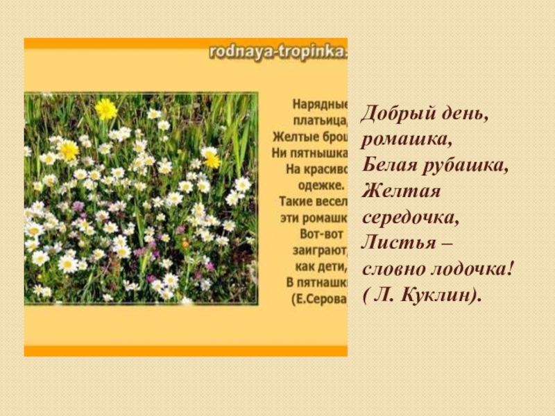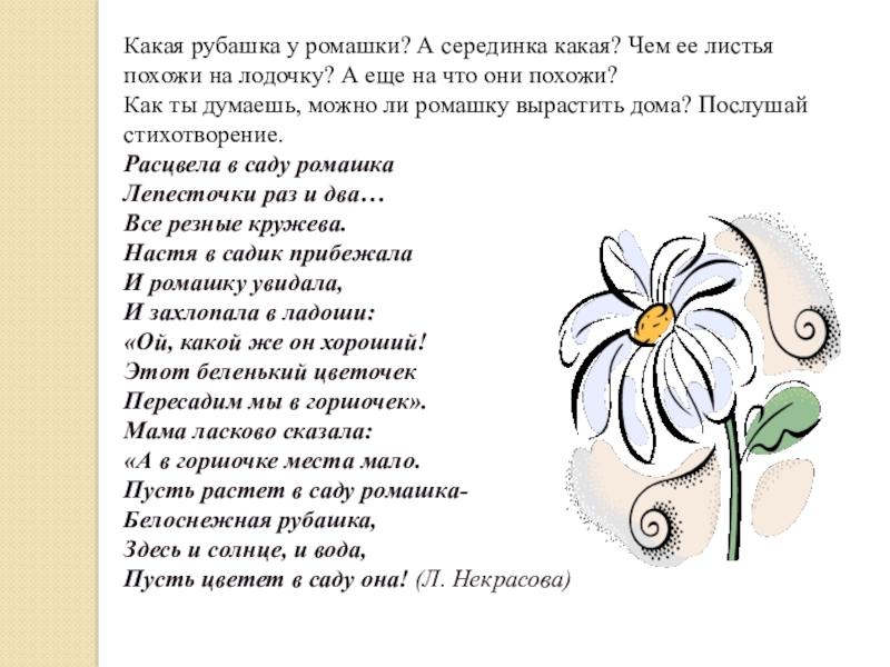 Слайд 13Какая рубашка у ромашки? А серединка какая? Чем ее листья похожи