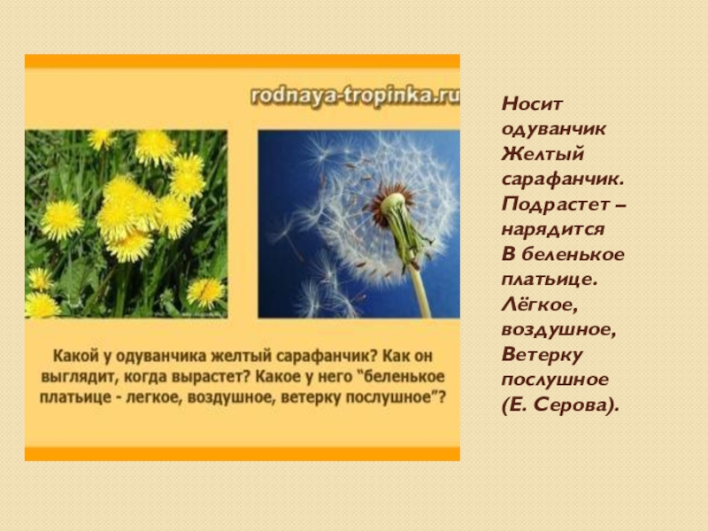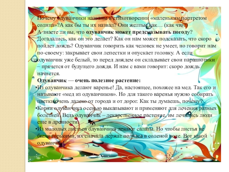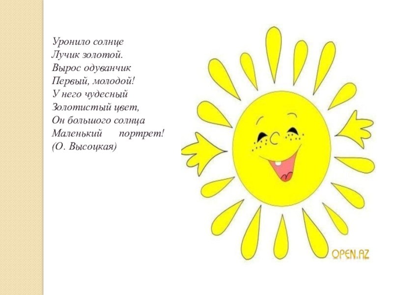 Слайд 5Почему одуванчики названы в стихотворении «маленьким портретом солнца»?А как бы ты