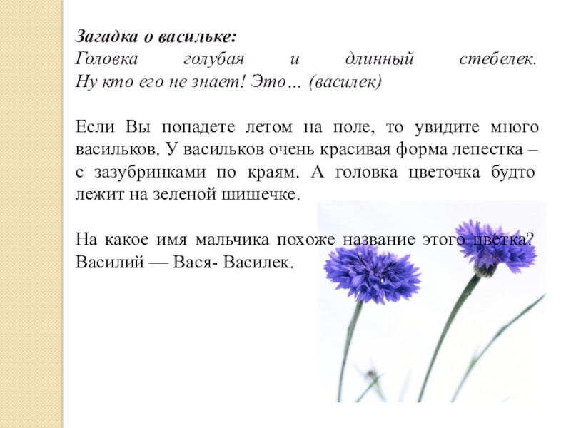 На какое имя мальчика похоже название этого цветка? Василий — Вася- Василек.
