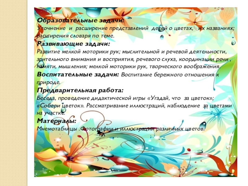 Уточнение и расширение представлений детей о цветах, их названиях;